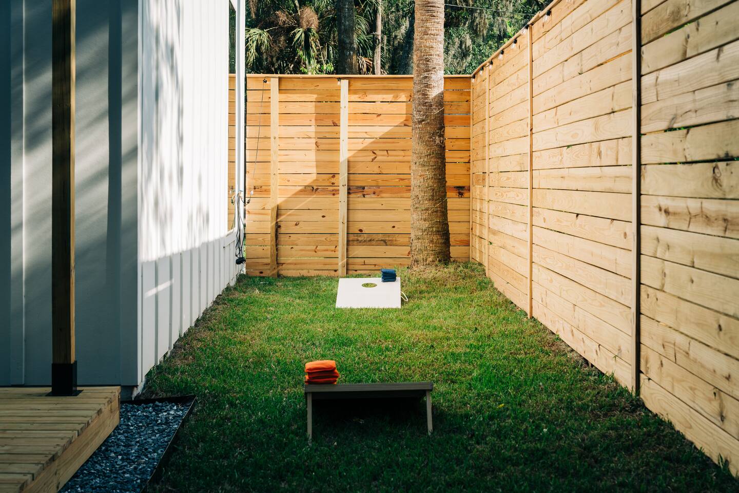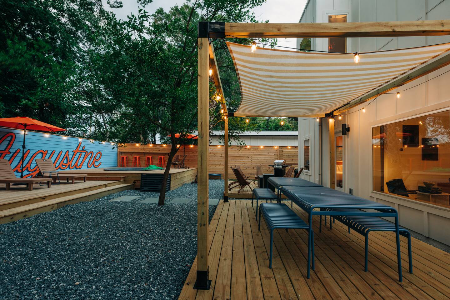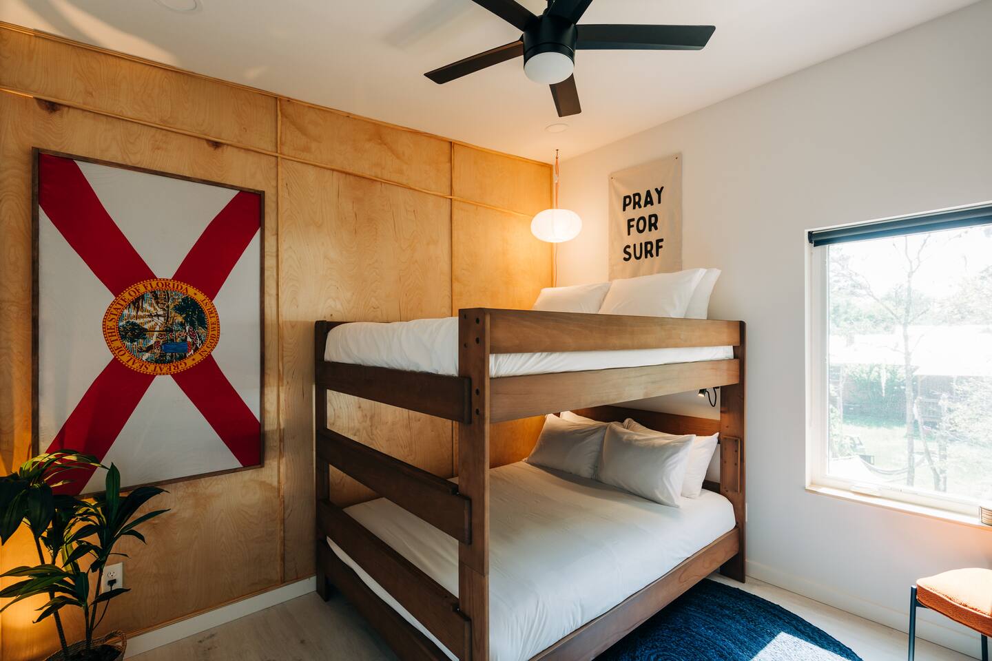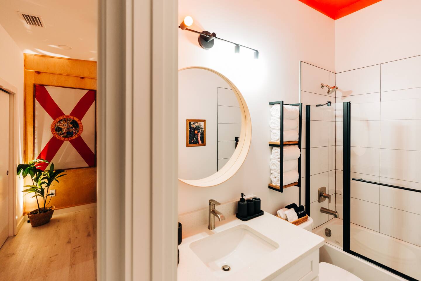 *Please Note: You cannot book on behalf of someone else. The person booking the property must be staying during the rental period.* — Booking for other people and/or groups is not permitted (per AirBnb regulations)- unless previously inquiring and confirming with hosts. Thank you! Amenities: · Billiards Table · 10 Foot Saltwater Cocktail Pool & Poolside Bar · Sun Deck With Umbrellas And Lounge Chairs · Corn Hole · Outdoor Dining · Fire Pit · Grill · 75” TV · Vinyl Record Player · Coffee & Cocktail Bar · Puzzles, Playing Cards, & Board Games · Laundry Room · Wi-Fi · Host Co. Hospitality Store * A rental contract will be sent to you via email upon booking and a signature will be required within 48 hours. The Space: The Pearl exists to offer a boutique hotel experience within a private, beautifully designed modern home, setting the stage for an unforgettable stay in America’s oldest city. With 3 bedrooms and 2 full bathrooms, this striking home can accommodate up to 8 guests. 🍊 Living Room: Genuine leather sectional, board games, vinyl record player with Bluetooth capability, two accent chairs, surf board decor, *hammock chair under the stairs* 🍊 Dining Room: Solid wood dining table for 8 that converts to a billiards table 🍊 Kitchen: Fully equipped gourmet kitchen, coffee & cocktail area 🍊 Room 01: Located on the lower level, king size bed, velvet headboard, reading lamps, wall mounted desk, views of the backyard, and a private entrance to the downstairs bathroom. 🍊 Room 02: Located on the upper level, king size bed, velvet headboard, reading lamps, and views of the surrounding neighborhood. 🍊 Room 03: Located on the upper level, queen size bunk bed, two desks, a full length mirror, cozy accent lighting, and views of the outdoor corn hole alleyway. 🍊 Outside: 40 foot sun deck, lounge chairs with umbrellas, 10 foot saltwater cocktail pool, private alleyway for corn hole, pergola-covered outdoor dining area, propane grill, gas fire pit 📍 Location: · On-Site Parking For 3 Vehicles 🌊 · Beaches: A short drive to the white sands and sparkling waters of Saint Augustine, Crescent, and Vilano beaches. · Historic Downtown: Just minutes away, explore charming streets filled with shops, restaurants, bars, music venues, and historic sites in America’s oldest city. · Local Attractions: Close to Flagler College, Historical Saint Augustine, St. Augustine Lighthouse, Castillo De San Marcos, and Anastasia State Park